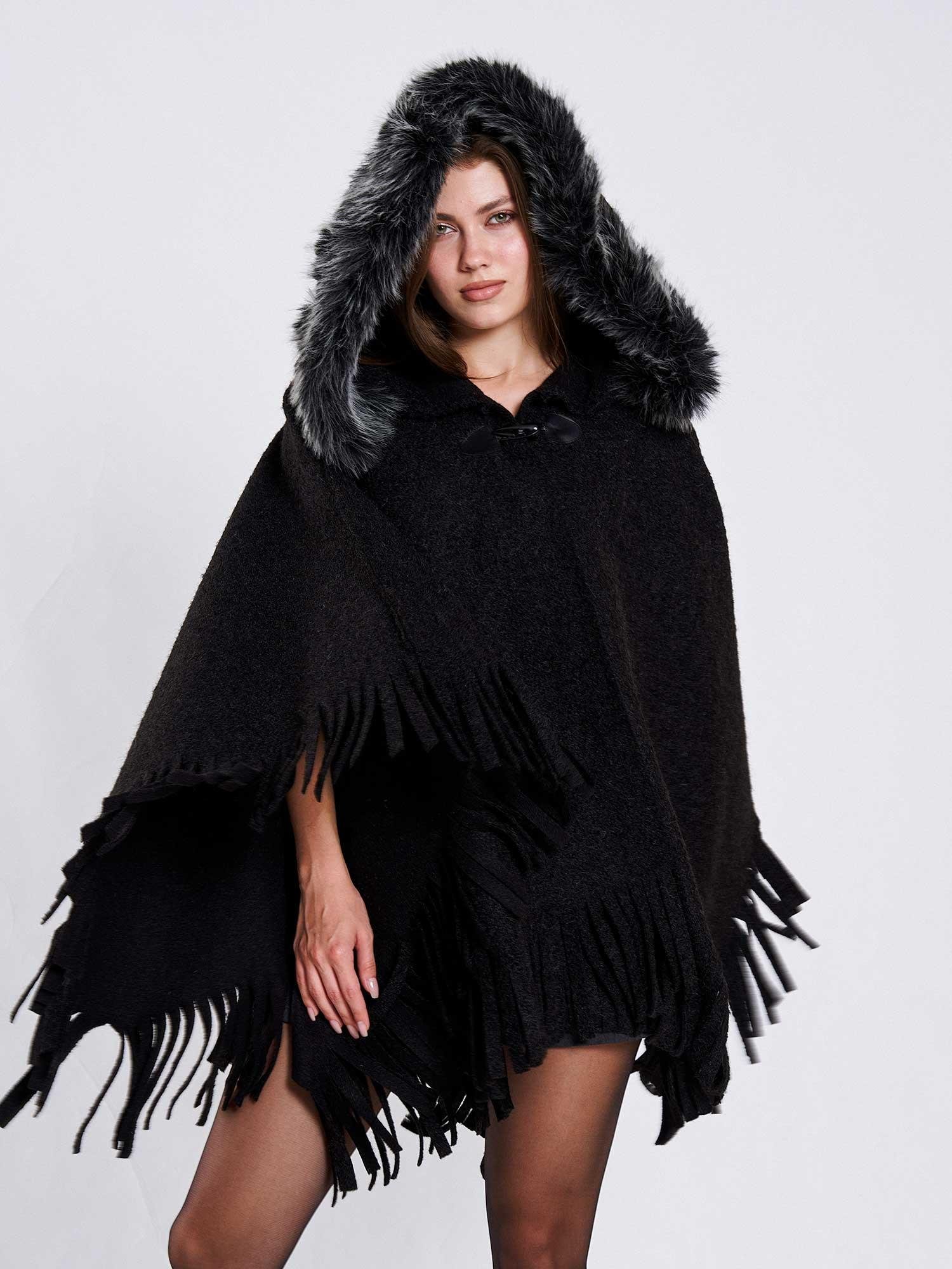 210022 Şapkası Kürklü Parçalı Panço SiyahCoral
