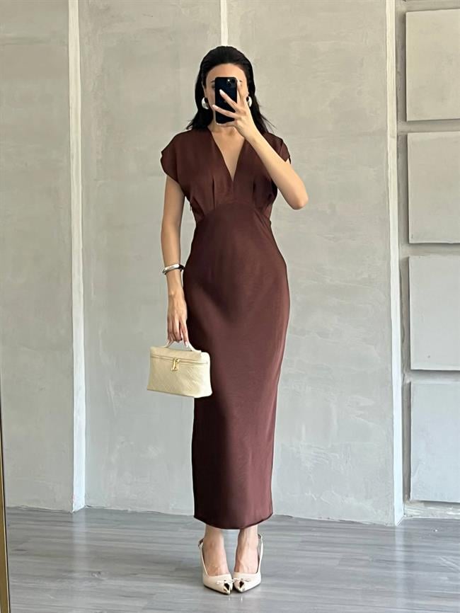 Açık Yaka Uzun Elbise Kahve