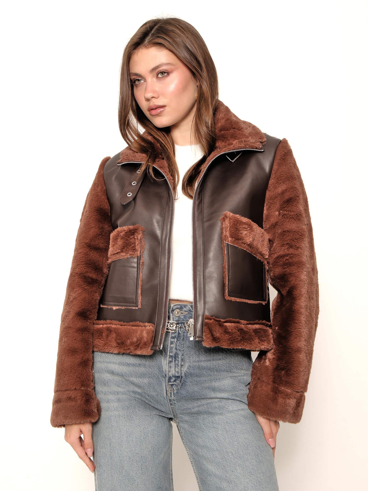 Çift Cepli Fermuarlı Derili Peluş Mont M2200 Kahve (W25W-AYR-00006)