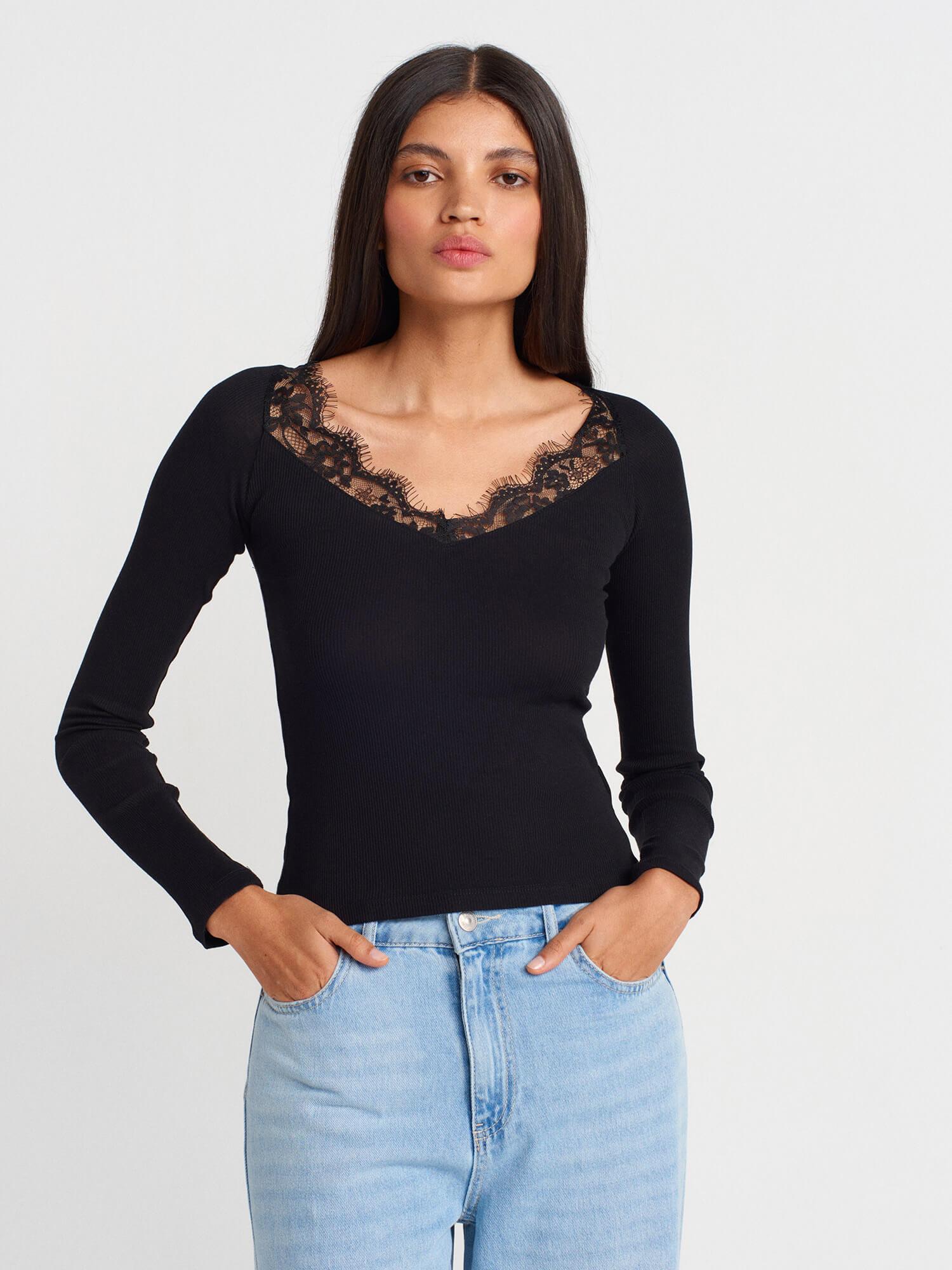 Dantel Şeritli Uzun Kollu Bluz 31782 Siyah Coral