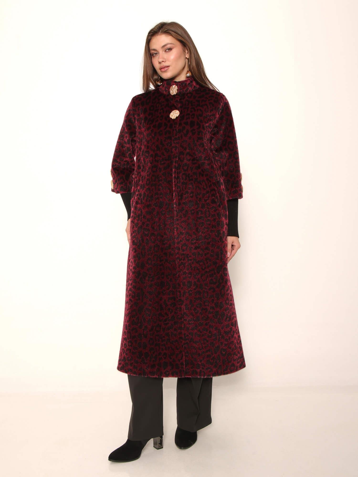 Desenli Düğme Detaylı Leopar Kaban 7958-1 BordoCoral