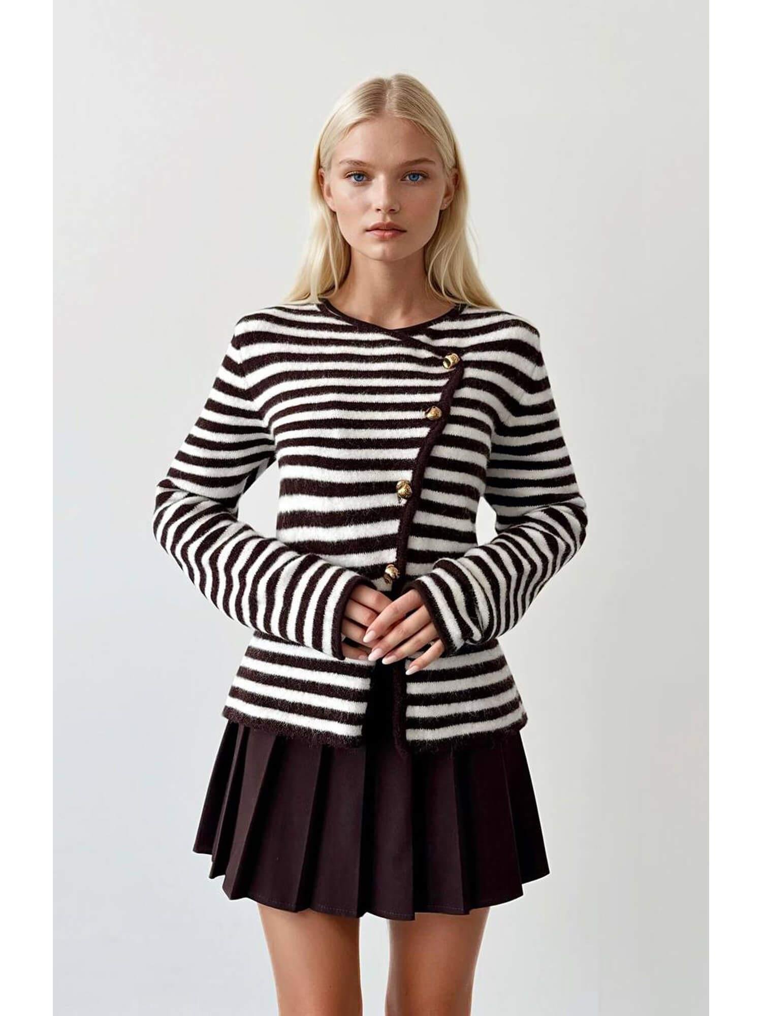 Gold Düğmeli Cizgili Hırka 4912 Kahve - EkruCoral
