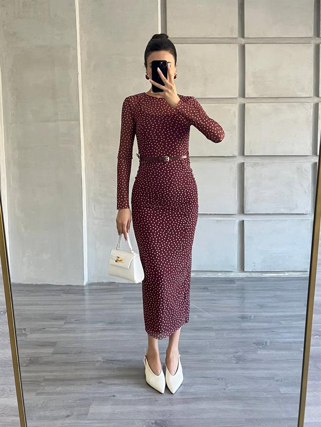 İnce Kemerli Puantiyeli Elbise Mürdüm (W25W-KUZ-00025)