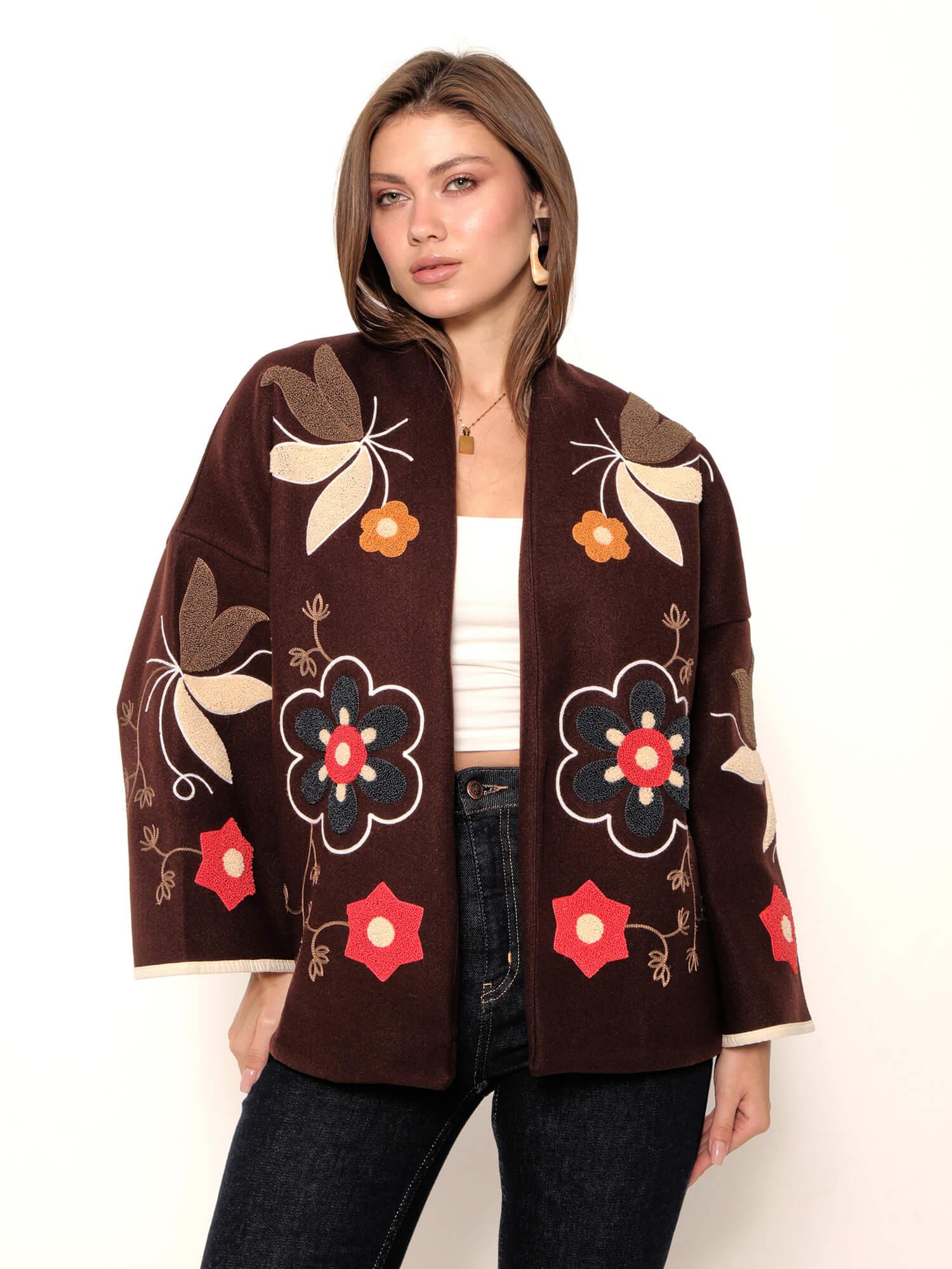 Kabartmalı Renkli Çiçek İşlemeli Ceket 6178 Kahve (W25W-SVG-00026)