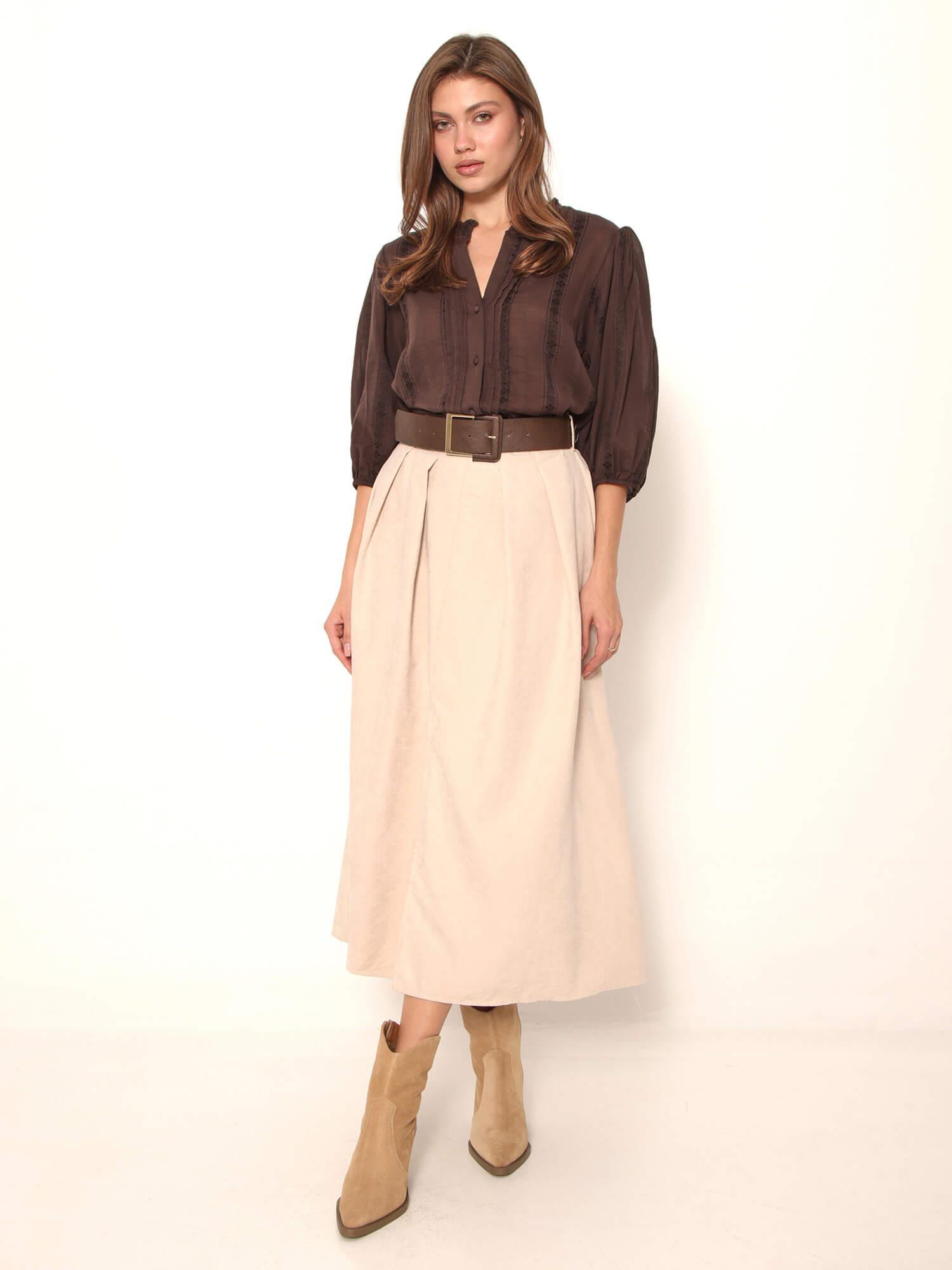 Kemerli Pileli Uzun Çan Etek 4081 Taş Kemerli Pileli Uzun Çan Etek 4081 Kahve