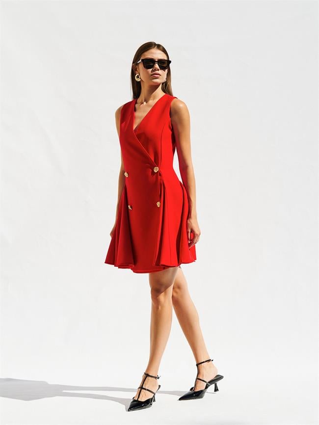 Kolsuz Mini Düğme Detaylı Elbise Kırmızı