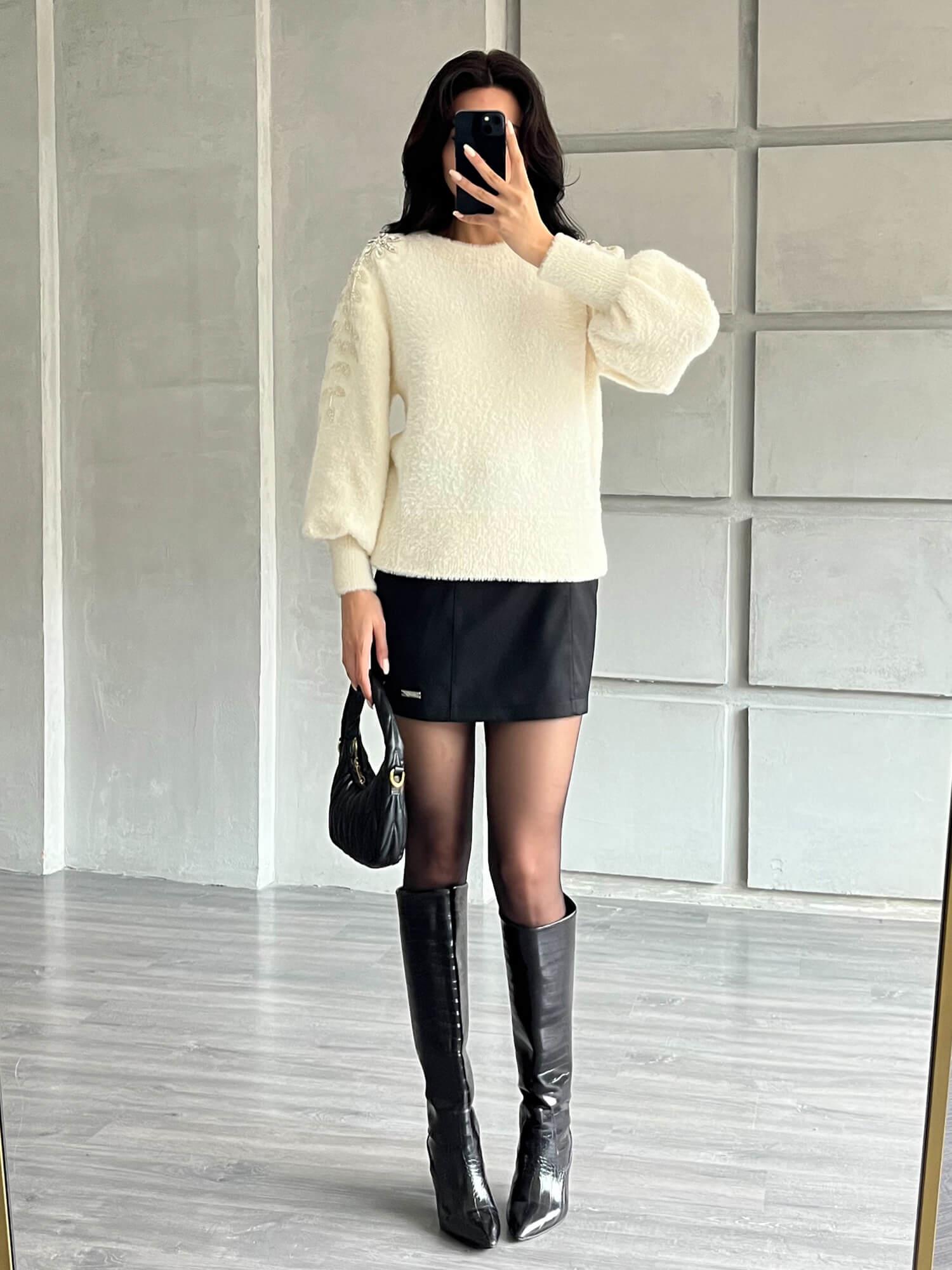 Omuzları Taşlı Yaprak İşlemeli Kazak 70442 Ekru (W25W-STN-00017)