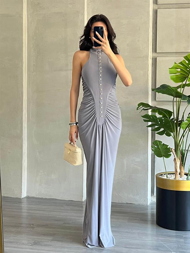 Önü Kuş Gözlü Yanları Büzgülü Elbise Gri