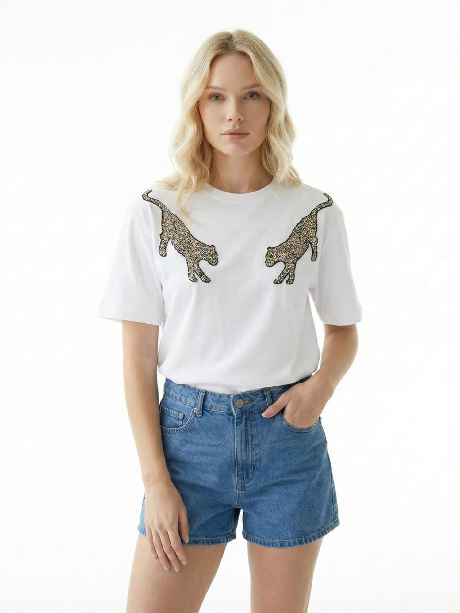 Pullu Çift Kaplan İşlemeli Tişört 7436 BeyazCoral