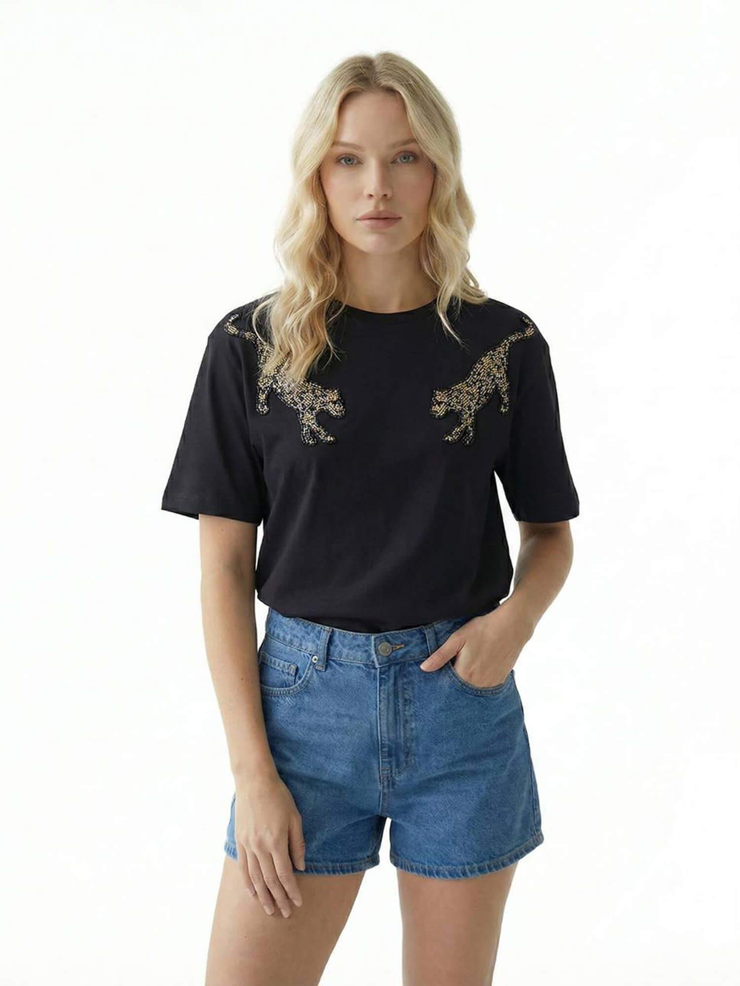 Pullu Çift Kaplan İşlemeli Tişört 7436 SiyahCoral