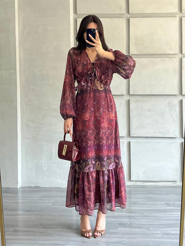 Şal Desenli Midi Elbise Kahve Şal Desenli Midi Elbise Bordo