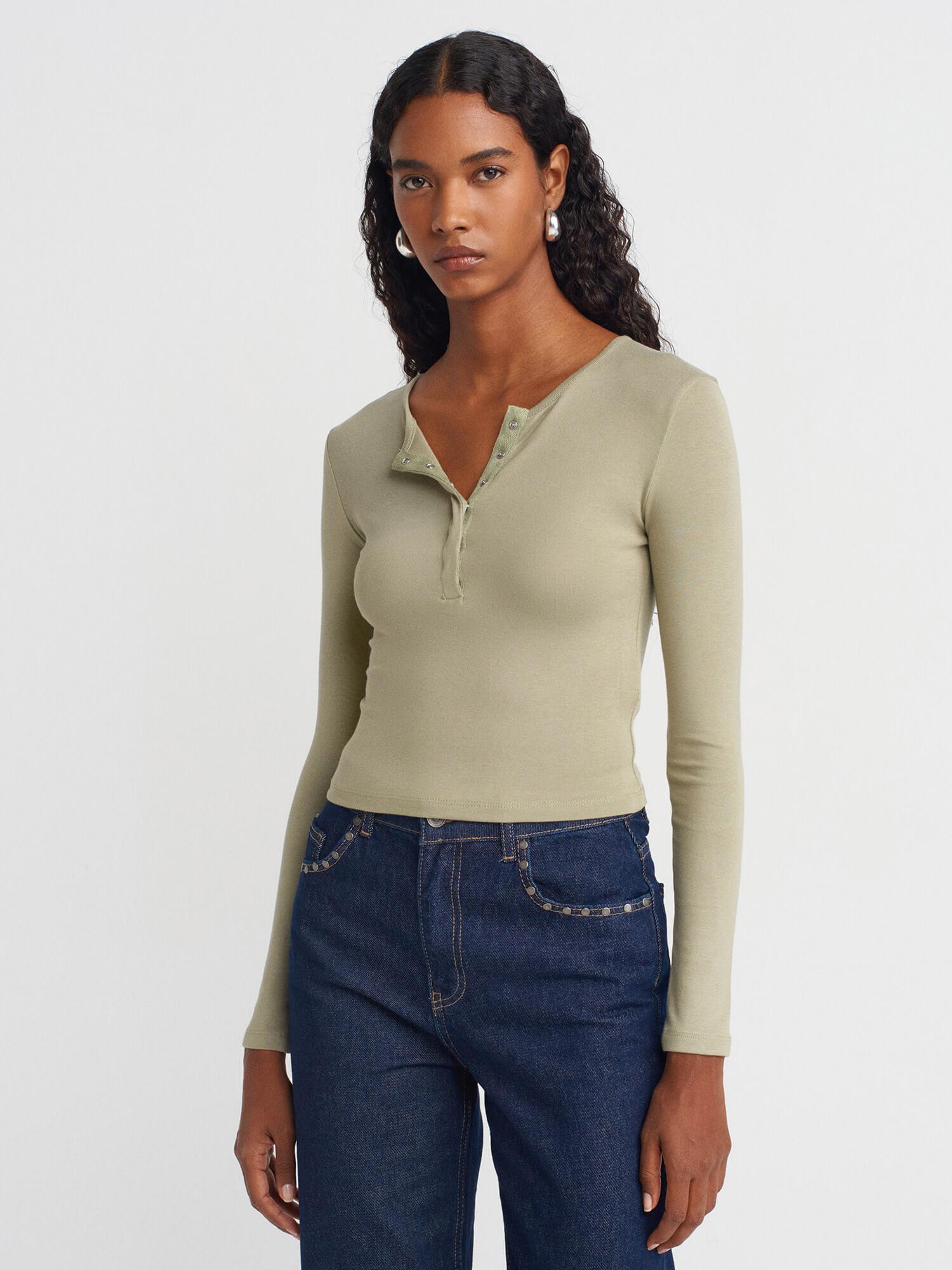 Uzun Kollu Çıtçıt Düğmeli Kazak 31442 Çağla Yeşili (W25W-DLV-00014)