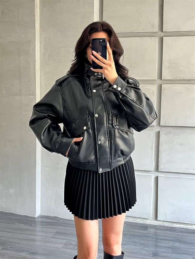 Yakası Kemerli Deri Ceket 509254 Siyah (W25W-HFO-00009)