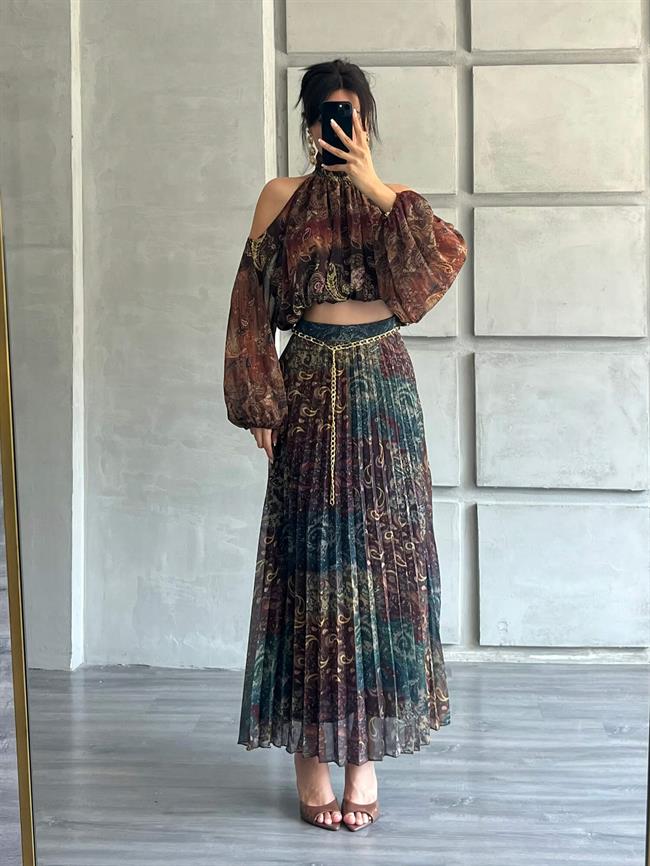Zincir Kemerli Piliseli Etek Haki Zincir Kemerli Piliseli Etek Kahve Zincir Kemerli Piliseli Etek Bordo